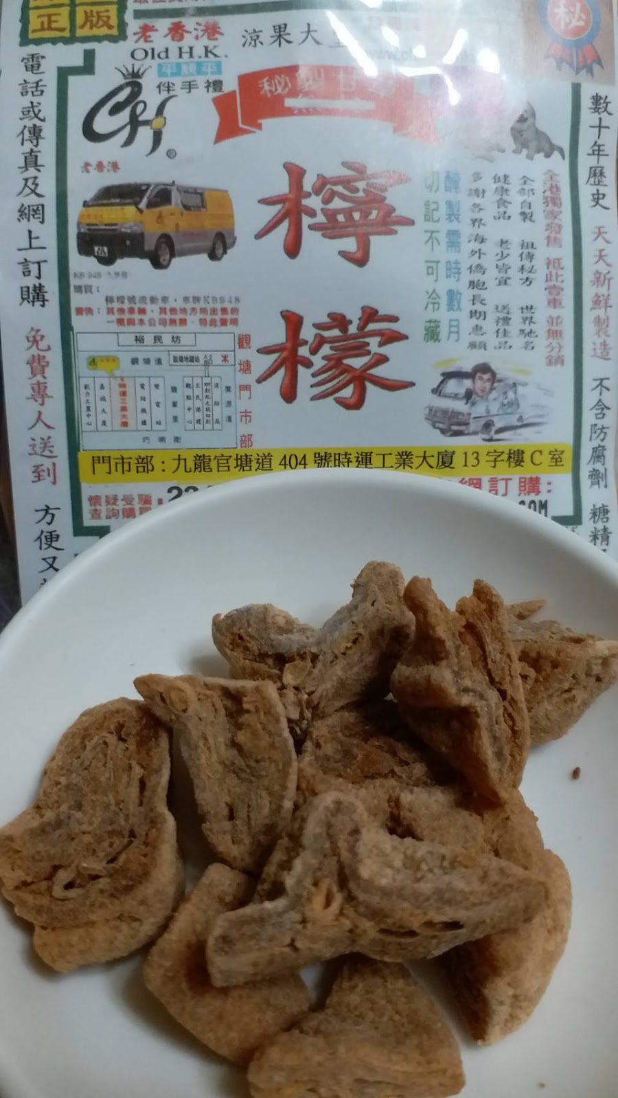 老香港 涼果大皇的包裝前後都印著滿滿的告知事廣告.