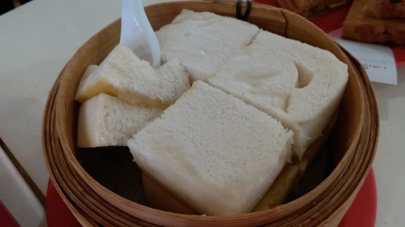 覺得新奇用蒸籠裝,其實吃起來是有點像鬆鬆軟軟白饅頭塗咖椰醬😄😄(真的有台式早餐的FU,只有想到這樣形容應該比較貼切),雖然土司蒸過但是表皮不會過顯.